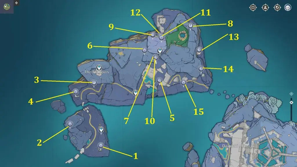 엔카노미야(연하궁) 협곡 모든 15개 건문(열쇠) 위치, 표시된 위치의 트리 위에.