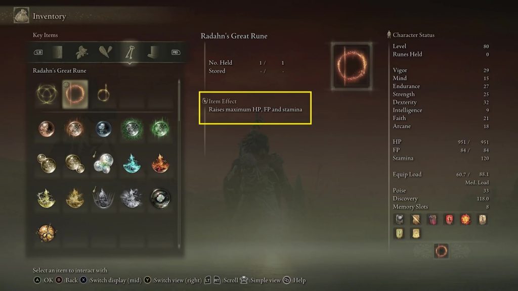 엘든링 디바인 타워 (Caelid Divine Tower: Radahn's Great Rune) 활성화 방법, 룬을 사용하려면모든은혜의사이트에서 쉬고 위대한 룬을 준비하십시오.이제 위대한 룬을 활성화시켜야 할 것이다.활성화하려면Rune Arc를 사용해야 한다.그레이트 룬이 장착되어 있고 룬 아크(RuneArc)를 소비했을 때 HP, FP, 스태미너 바가 늘어난 것을 볼 수 있다.그 효과는 죽을 때까지 활동할 것이다.
