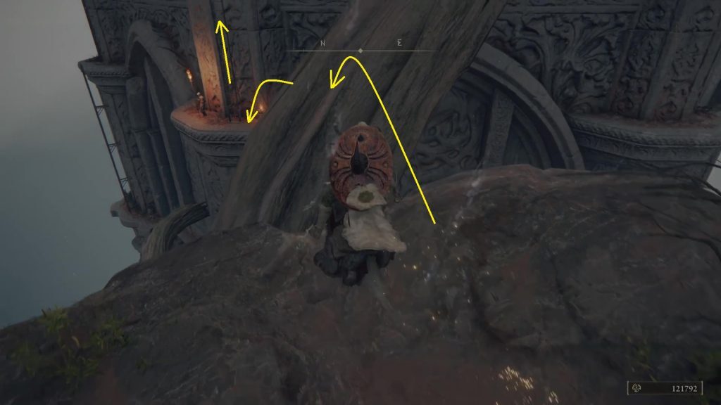 남서쪽에서 신성한 카엘리드 탑으로 접근한다.그런 다음 아래와 같이 나뭇가지에 올라타십시오.만약 당신이 나뭇가지에 뛰어오를 수 없다면, Torrent의 더블 점프를 사용하라.나뭇가지에서 앞쪽 선반 위로 뛰어오른 다음 아래와 같이 사다리를 올라간다.