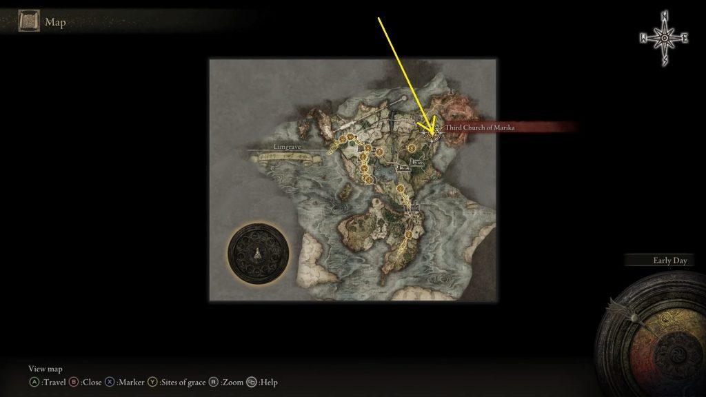 아래 그림에 표시된 위치에서 마리카 제3교회의 동상 발치에 있는 신성한 찢김을 발견할 수 있을 것입니다.