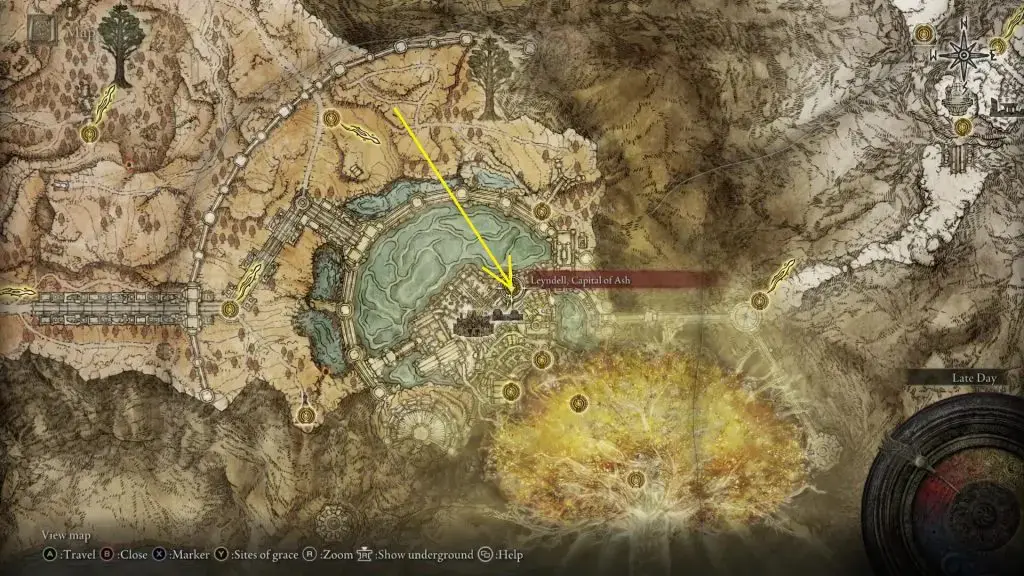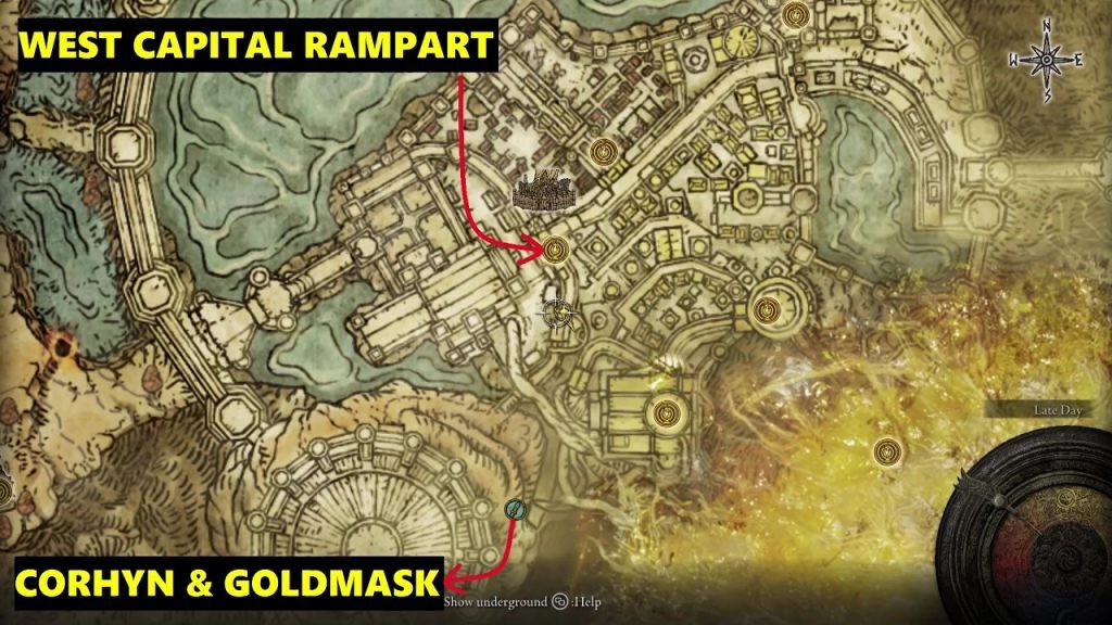 아래 그림에 표시된 위치에 코린과 골드마스크가 있습니다. 나는 West Capital Rampart of Grace에서 오는 길을 보여줄 것입니다.