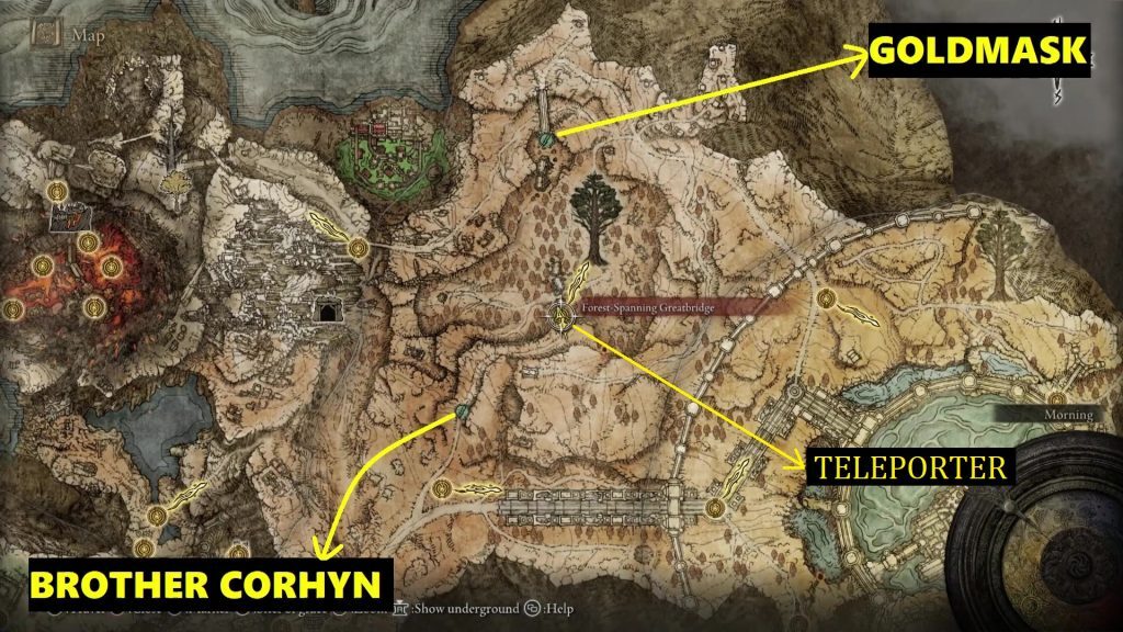 엘든링 코린 형제 & 골드마스크 퀘스트 위치 & 엔딩, 코힌의 위치에서 북쪽 길로 가면 아래 그림과 같이 숲-스페인 대교가 나옵니다. Forest-spanning Greatbridge에서 텔레포터를 사용하면 골드마스크가 있는 브리지 부분으로 이동됩니다. 골드마스크에 도착하기 위해 남쪽으로 조금 이동하여 그와 대화하십시오.