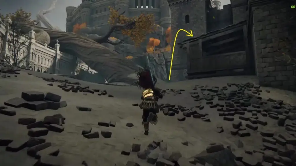 이스트 캐피탈 램파트 오브 그레이스(East Capital Rampart Of Grace)에서 문 밖으로 나간 다음 좌회전하여 직진합니다. 곧 아래와 같이 큰 괴물이 앞에 있는 문에 도달할 것입니다. 여기 오른쪽 발코니에서 뛰어내린 후 아래 그림과 같이 문 안으로 들어가십시오.
