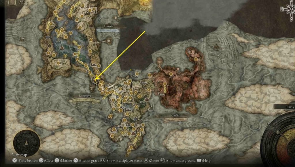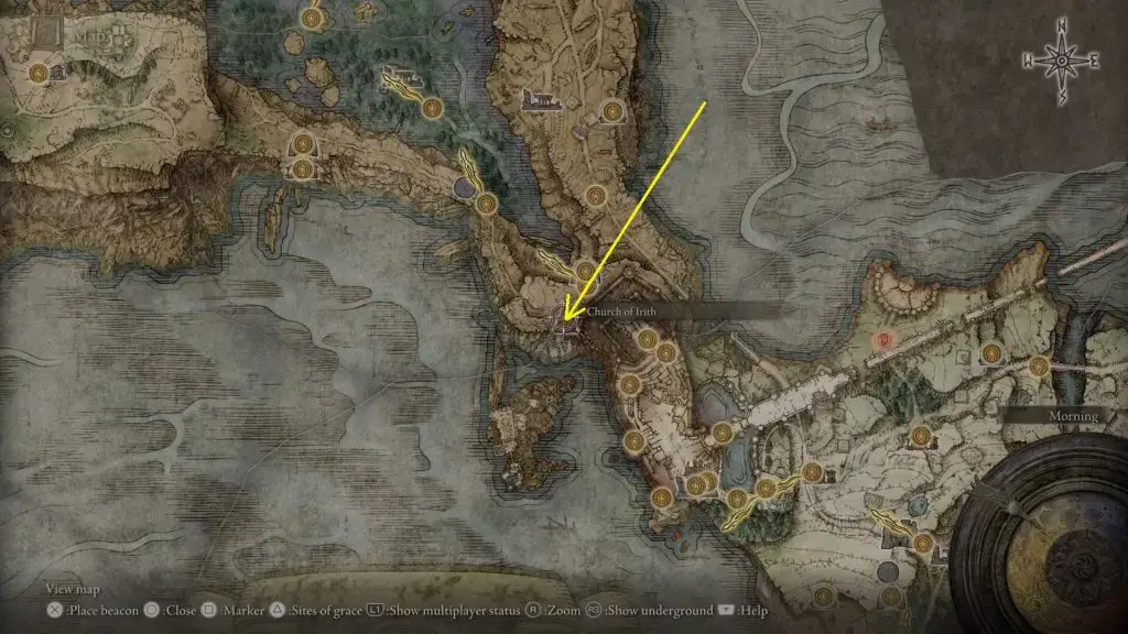 엘든링 Erudition Thorps (에러디션 토푸스) 퀘스트 위치 & 얻는 방법, 아래 그림에 표시된 위치의 리르니아에 있는 이리츠 교회에서 홉스를 찾을 수 있을 것입니다.