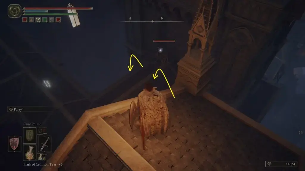 거기서 아래 지붕으로 뛰어내립니다. 그리고 아래 그림과 같이 탑에 도달할 때까지 지붕 위를 계속 남쪽으로 걸어라.