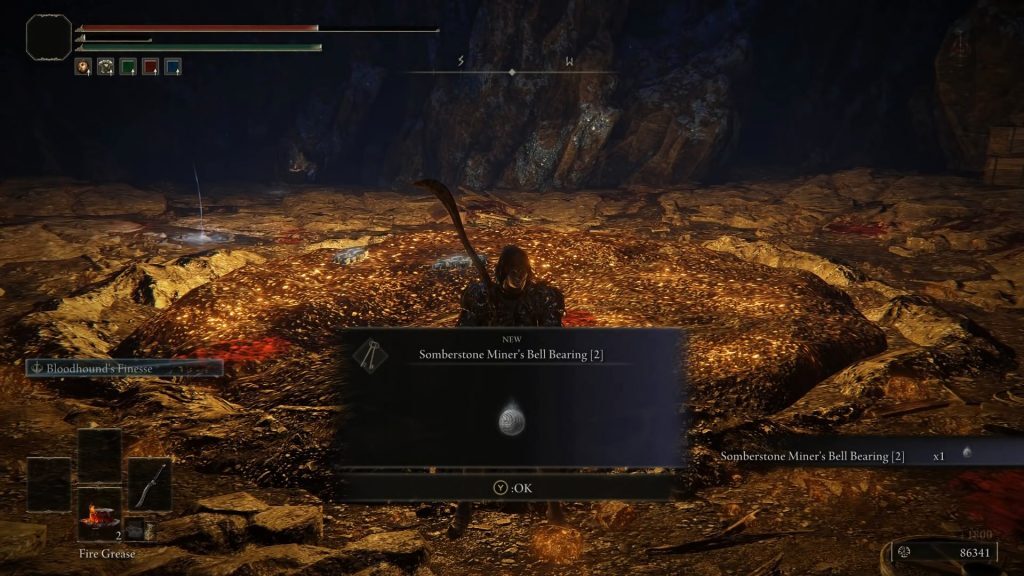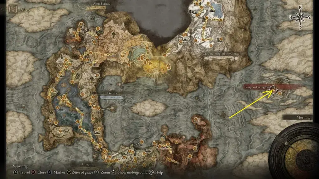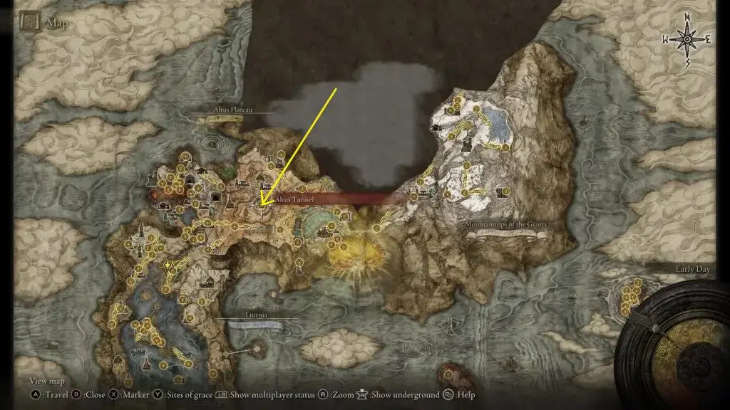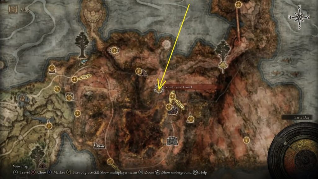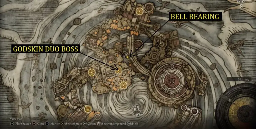 엘든링 Sullim Smithing Stone 1,2,3,4,5,6,7,8,9 | 구입 방법, 아래 그림과 같이 자이언츠의 마운틴탑에 있는 마리카 제1교회 북서쪽에 있는 침울스톤 광부의 벨베어링[3]이 있습니다.
