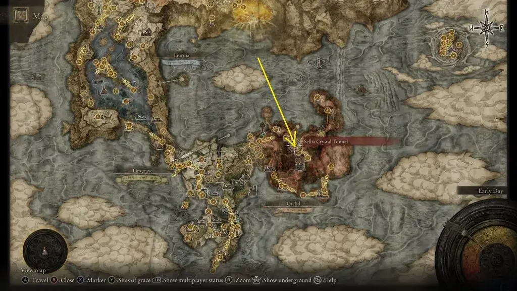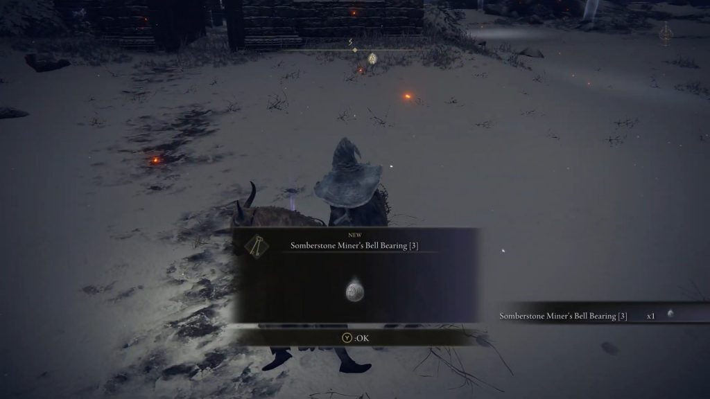 엘든링 Sullim Smithing Stone 1,2,3,4,5,6,7,8,9 | 구입 방법, 아래 그림과 같이 자이언츠의 마운틴탑에 있는 마리카 제1교회 북서쪽에 있는 침울스톤 광부의 벨베어링[3]이 있습니다.