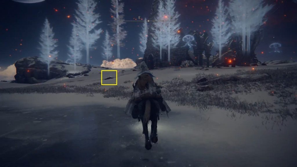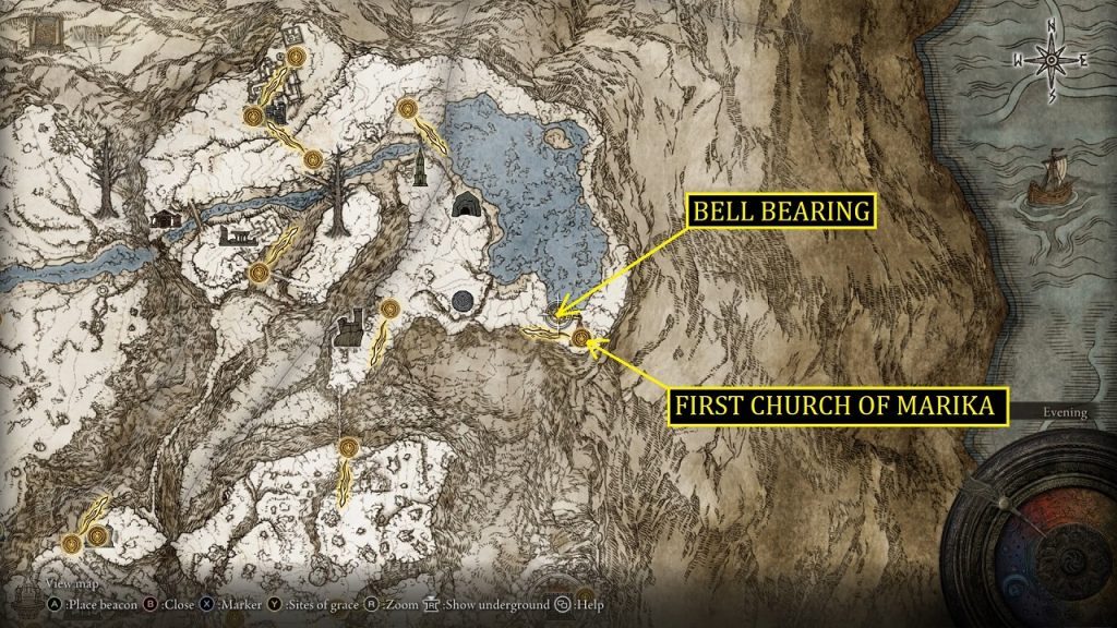 Sullivstone Miner's Bell Bearing[4]은 게임 후반부까지 받을 수 없습니다. 우선 지도 북동쪽 눈밭에 있는 소방대 보스를 물리쳐야 할 것입니다. 이렇게 하면 오른쪽에 있는 작은 섬이 열리게 될 것입니다. 이 섬에서 폭풍우를 마주하는 발코니로 이동하십시오. 당신은 아래의 그림과 같이 이 은혜의 장소 근처에서 Sullivstone Miner's Bell Bearing[4]을 찾을 수 있을 것입니다.