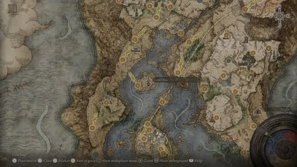 이 가이드는 엘든 링에 있는 테투의 상승탑에서 "세 마리의 현명한 야수 찾기" 퍼즐을 푸는 방법을 보여준다. 퍼즐을 풀고 나면 메모리 스톤을 얻을 수 있을 것이다. Testu's Rise는 아래 그림에 표시된 위치의 Luurnia의 북쪽에 있다. 그것은 "소서러 섬" 은총의 장소의 동쪽이다.