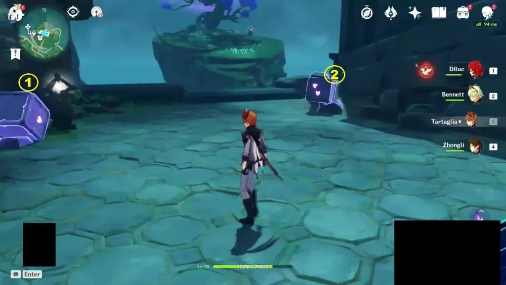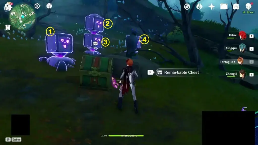 강조 표시된 위치로 이동하여 동상 앞에 있는 '페쿨리아 피니언' 가젯을 사용하십시오. 이것은 스톰스톤을 드러낼 것입니다. 전기 공격으로 스톰스톤을 쳐라.이렇게 하면 근처의 동상이 빛나게 될 것입니다. 이제 이 조각상 앞에 있는 '페쿨리아 피니언' 기구를 사용하여 또 다른 스톰스톤을 공개하십시오. 스톰스톤을 쳐서 다른 동상을 밝혀라.스톰스톤 4개를 칠 때까지 계속 해.숨겨진 4번째 스톰스톤을 치면 퍼즐이 완성되고 정교한 가슴이 탄생할 것입니다.