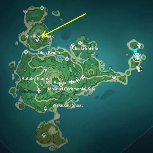 시라이 신사에서 강조 표시된 위치로 이동하여 동상 앞에 있는 '페쿨리아 피니언' 기구를 사용하십시오. 이것은 서쪽 아래 4개의 정육면체를 드러낼 것입니다. 퍼즐을 풀려면 정육면체 전체에 같은 수의 잎이 빛나게 해야 합니다. 퍼즐을 푸는 것은 놀라운 가슴을 낳는입니다.
