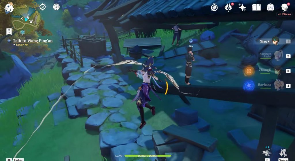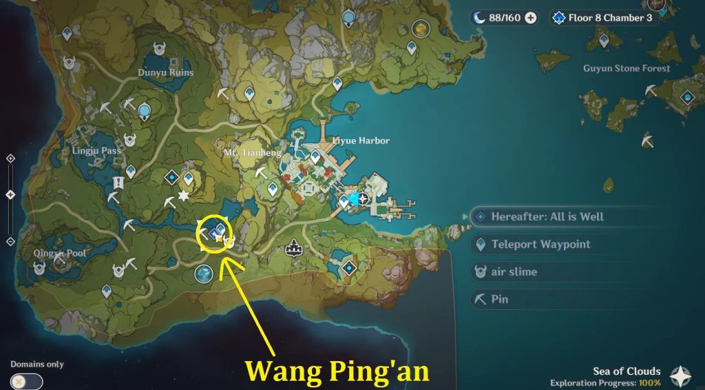 원신 괴상한 점괘 및 후일 만사 평안 월드 퀘스트 공략, 퀘스트가 시작되면, 당신의 첫 번째 목표는 왕핑안과 대화하는 것입니다. 아래 이미지와 같이 테비야트의 리유 하버에서 서쪽으로 왕핑안을 찾을 수 있습니다. 가장 가까운 텔레포트 경유지로 가서 왕핑안과 오래된 오두막 안에서 대화하십시오. 그는 당신에게 보물 보관자로부터 배달 경로를 보호하라고 말할 것입니다.
