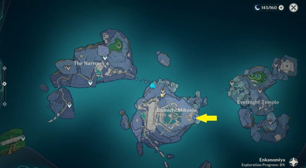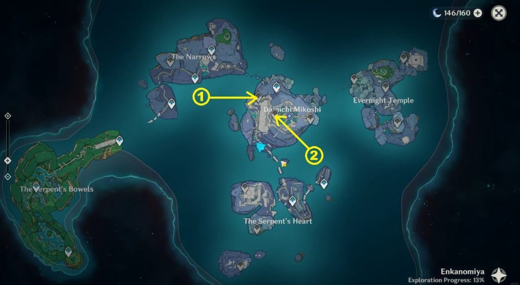 원신 뱀의 심장 지하에 있는 호수 가는 방법 & 도서관 퍼즐, 엔조우와 대화한 후 북쪽 길로 가 아래 사진에서 '1'로 표시된 텔레포트 웨이포인트에 도달하십시오. 그리고 계단을 이용해 다이니치 미코시 정상에 있는 텔레포트 웨이포인트('2'로 표시)에 도달합니다. 텔레포트 웨이포인트 '2' 앞에 다이니치 미코시 입구가 있습니다.