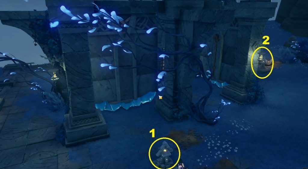 강조 표시된 위치에는 아래 그림과 같이 2개의 삼각 메커니즘이 있습니다. 두 메커니즘을 모두 공격하여 활성화하십시오. 이렇게 하면 벽이 움직이며 안으로 들어가 황금 고개가 들어 있는 가슴에 닿을 수 있는 길이 열립니다.