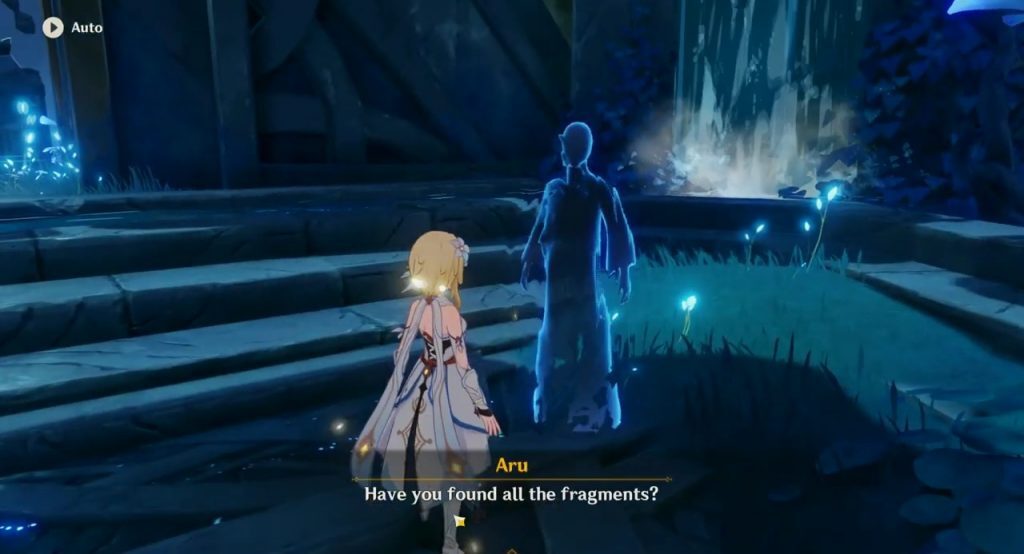 파편 세 개를 모았으면 다이니치 미코시로 돌아가 아루와 대화합니다. ARU가 없으면 메커니즘과 상호 작용하여 Evernight로 전환하십시오. 그리고 아루에게 말을 걸어 세 조각과 황금 브리들을 그에게 주어라.