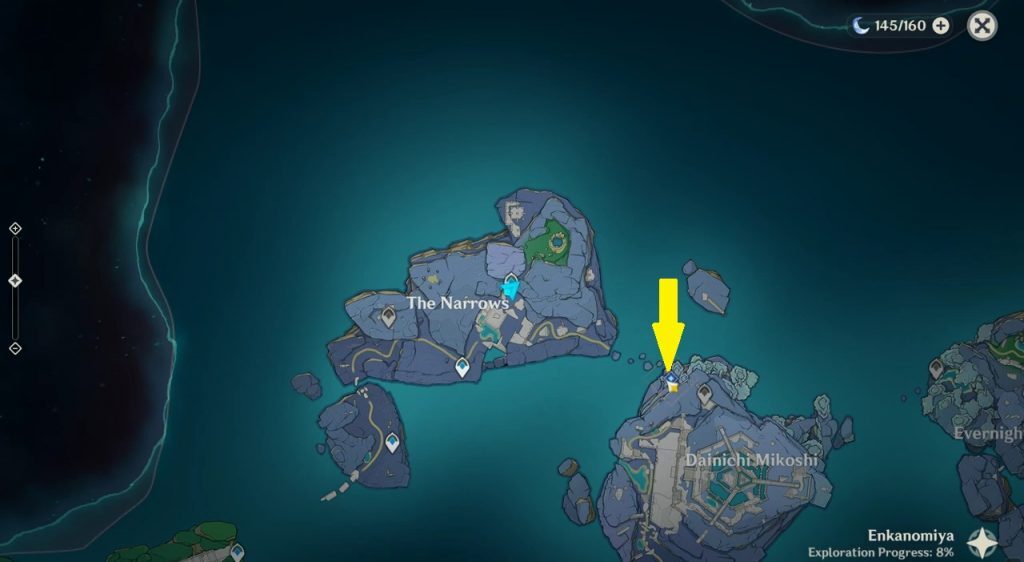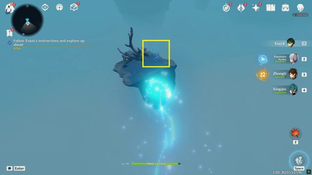 이제 아래 그림에 표시된 위치로 북쪽으로 이동하십시오. 그곳에 도달하기 위해서는 두 개의 공 모양의 위상 관문을 건너야 할 것입니다. 표시된 위치에 엔주(Enjou)가 있습니다. 엔조우와 대화하십시오.
