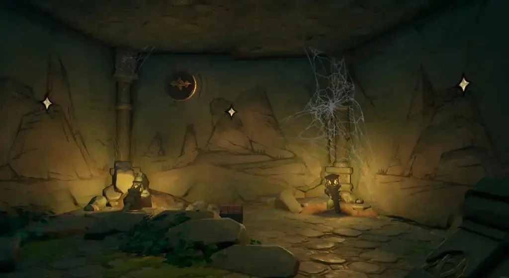 세 개의 별 모양의 보석이 있으면 첫 번째 문을 통과하십시오. 이 방에서는 벽화 세 개가 오른쪽에 있는 방을 볼 수 있습니다. 벽화에 있는 보석을 사용하세요.이것은 벽화에서 3개의 전자 실리를 날게 할 것입니다.