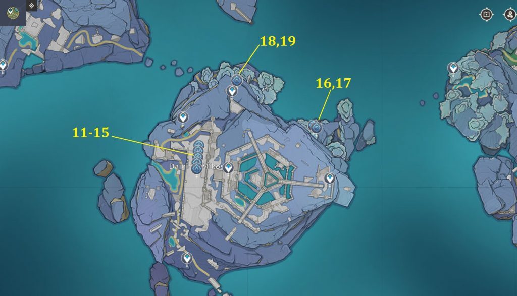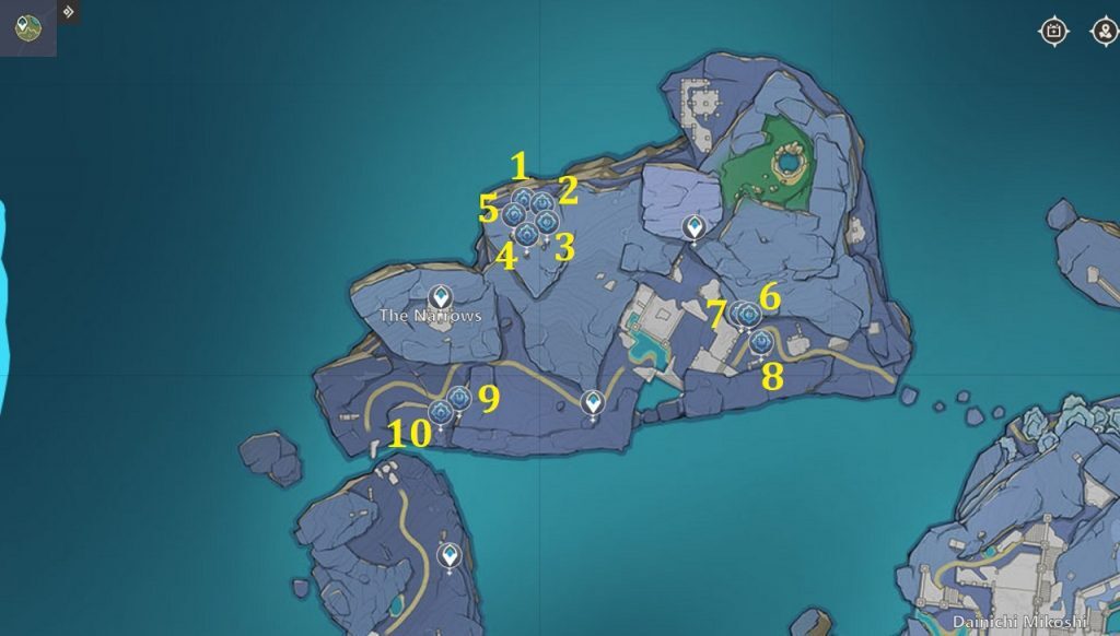원신 엔카노미야 지역:59개 모든 봉인 위치(뱀의 심장), 이 둘은 '비샤프 연구실'이라는 이름의 숨겨진 섬에 위치해 있습니다. 이 섬은 미코시 다이니치에서 엔카노미야 위상문을 이용해 갈 수 있습니다.