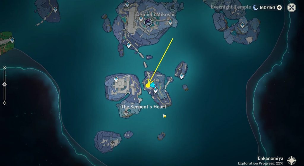 [원신] 연하궁(엔카노미야):모든 화려한 상자 위치 & 퍼즐, 이제 올바른 순서를 알았으니 아래 그림에 표시된 위치에 있는 뱀의 심장으로 가십시오.