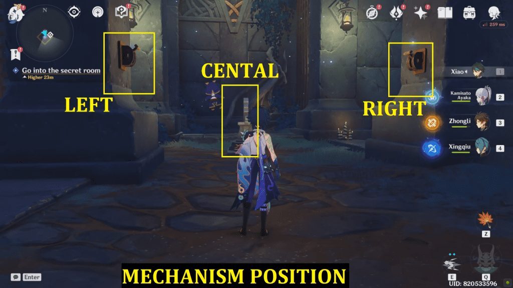 비밀의 방 안에서 당신은 메커니즘 퍼즐을 발견할 것입니다. 두 개의 서로 다른 기둥에 부착된 기계식 레버가 두 개 있고, 가운데 한 개는 정상적인 타격으로 작동할 수 있습니다. 당신은 또한 한쪽 구석에 있는 밀실에서 '태양과 달'의 메커니즘을 발견할 것입니다. 아래 이미지를 참조하십시오. 다음 순서에 따라 메커니즘으로 그들과 상호작용하십시오.