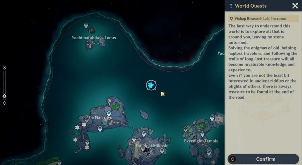 원신 연하궁 월드 임무 3색 파일: 실험 기록 비밀 퀘스트, 퀘스트를 시작하려면 아래 사진과 같이 다이니치 미코시 북쪽에 있는 떠 있는 섬으로 가십시오. 여기 아래 두 번째 그림과 같이 공 모양의 위상 게이트가 있습니다. 위상 게이트를 입력하여 Vishap Research Lab에 도달하십시오.
