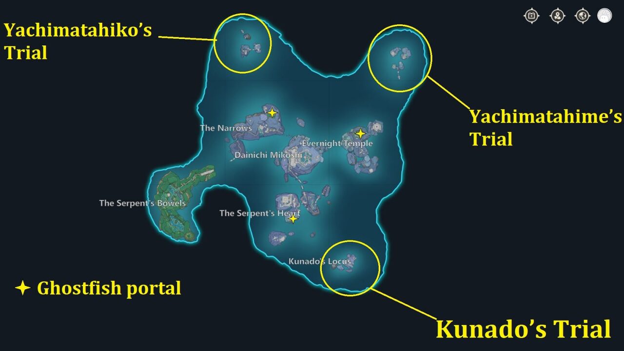 원신 연하궁 월드 퀘스트 - 에레보스(에레보)의 비밀: 3대 무술 시험, 지도 가장자리를 따라 있는 이 세 섬은 직접 도달할 수 없고 고스트피쉬 포털을 통해서만 접근할 수 있습니다. 이 고스트피쉬 포탈은 아래 지도에 표시된 물웅덩이에서 찾을 수 있습니다. 가장 가까운 텔레포트 웨이포인트로 이동하여 수영장으로 이동하십시오.