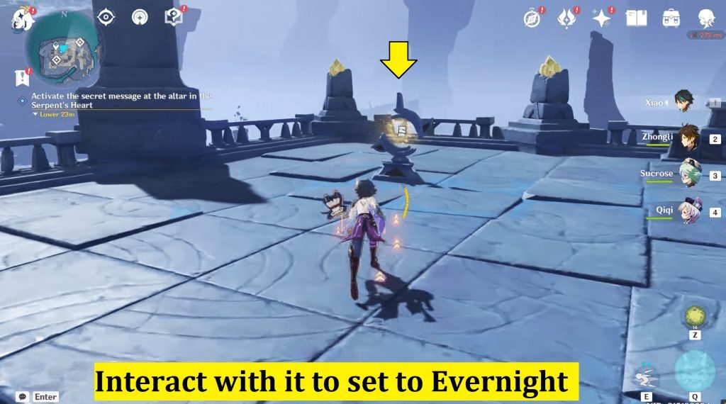 원신 우로보로스의 심장 퍼즐:뱀의 심장 제단 수수께끼, Evernight를 활성화한 후 제단에 들어가서 Investigate 스폿과 상호 작용하십시오. 이것은 절단면을 자극할 것이고 지면에 있는 기호가 밝혀질 것입니다.