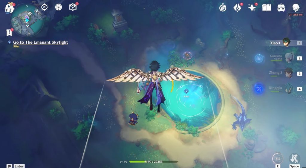 높이에서 수영장 중앙에 위치한 고스트피시 포탈로 이동하여 활공법을 활성화하십시오. 여기서 당신은 고스트피쉬 효과의 반경 내에서 당신의 체류를 조절해야 하며, 이것은 당신을 천천히 위로 떠오르게 할 것입니다. 결국, 당신은 당신을 그 떠다니는 섬으로 데려가는 포탈에 들어가게 될 것입니다. 세 개의 다른 고스트피쉬 포탈이 여러분을 떠다니는 세 개의 섬으로 데려다 줍니다.