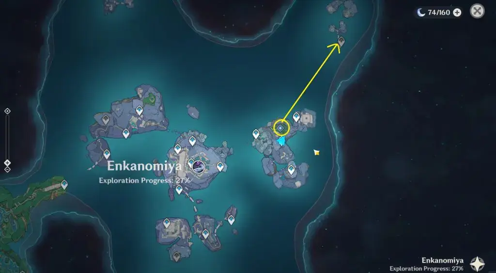에버나이트 사원 지역으로 이동하여 야치마타히메 로쿠스의 고스트피시 포탈 풀장에 표시된 위치로 이동하십시오. 높이에서 고스트피쉬 포탈로 뛰어올라 활공하기 시작합니다. 야치마타히메의 로쿠스로 안내하는 포탈로 들어갑니다.