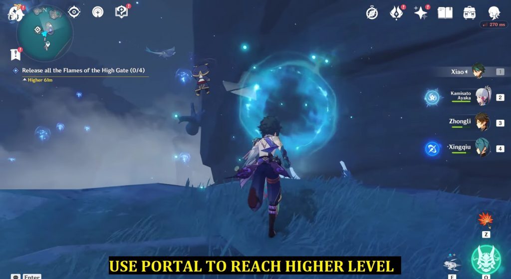 내부에서는 높은 문의 화염 4개와 모두 상호 작용해야 합니다. 더 높은 지면에 도달하려면 포탈을 사용하십시오.