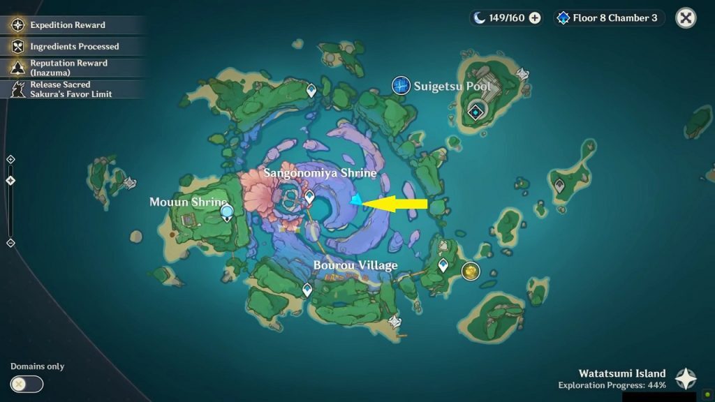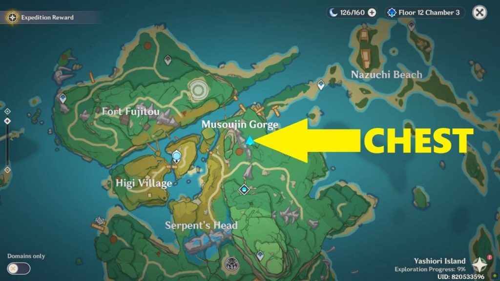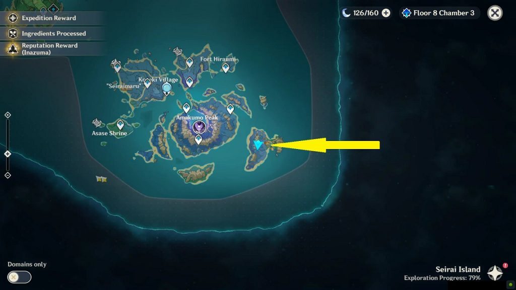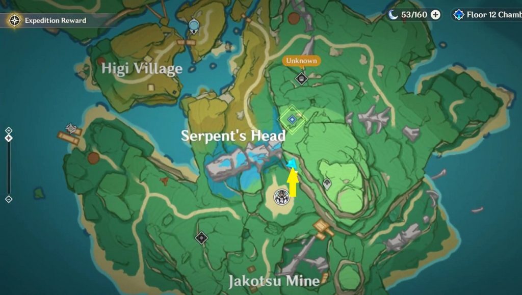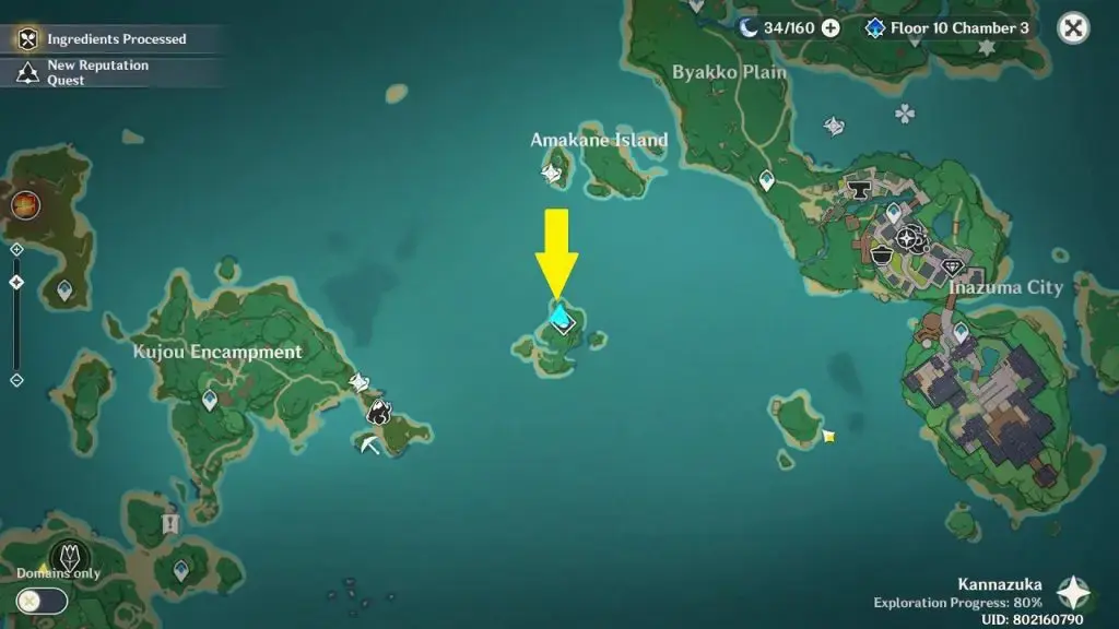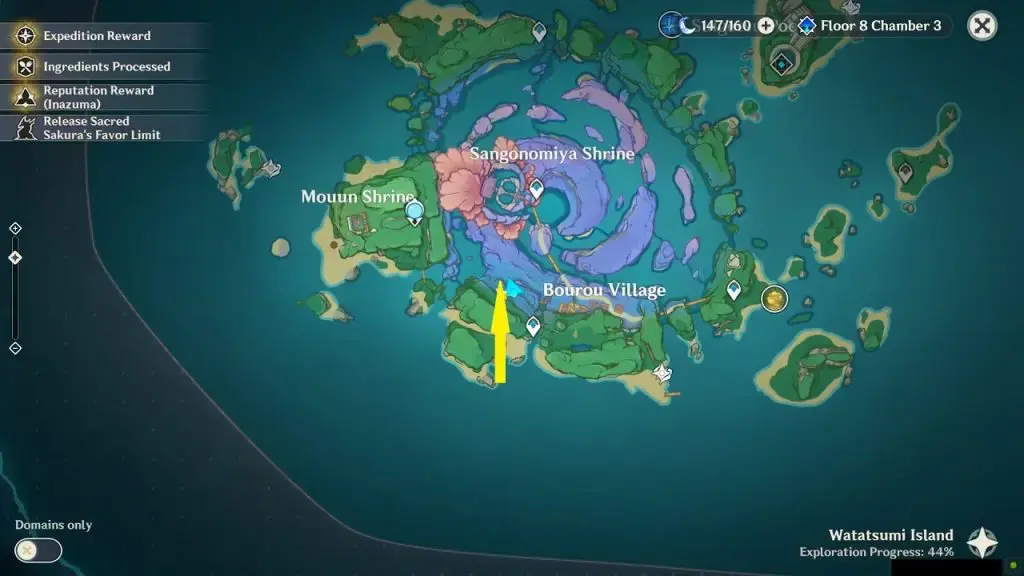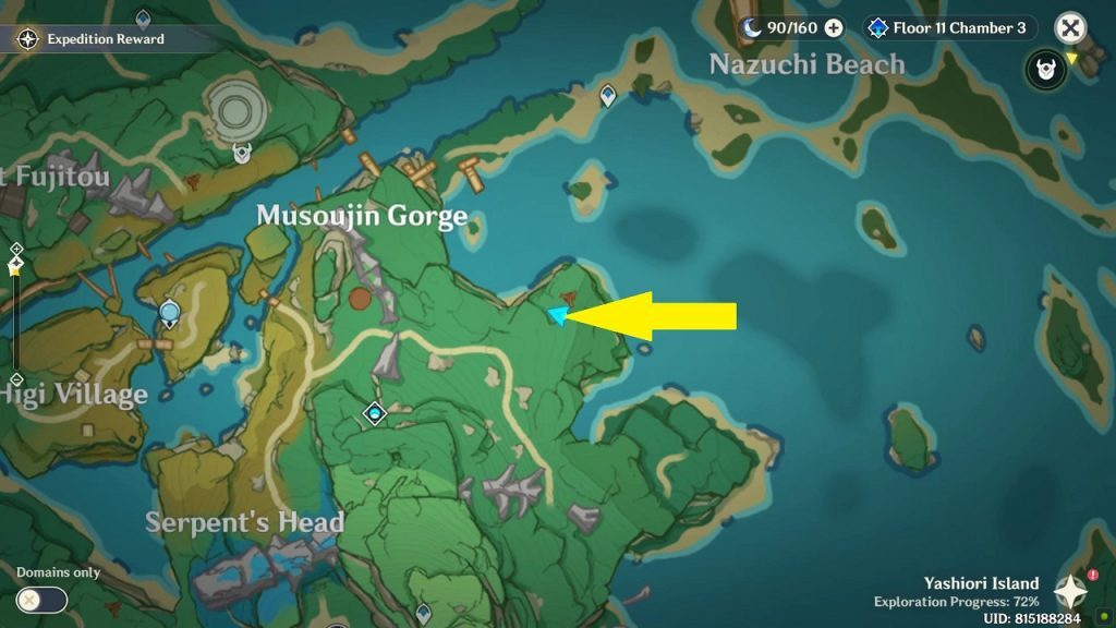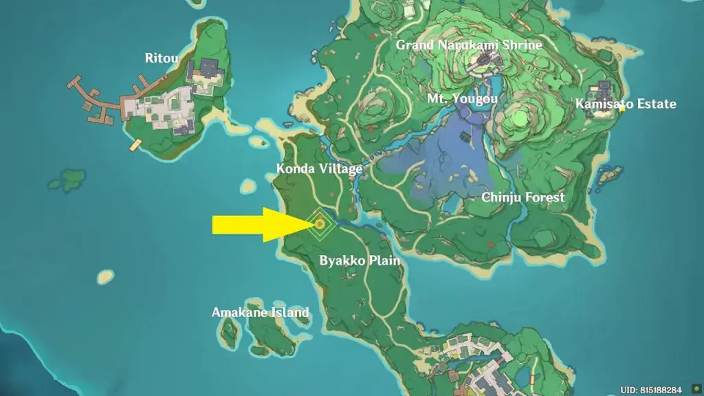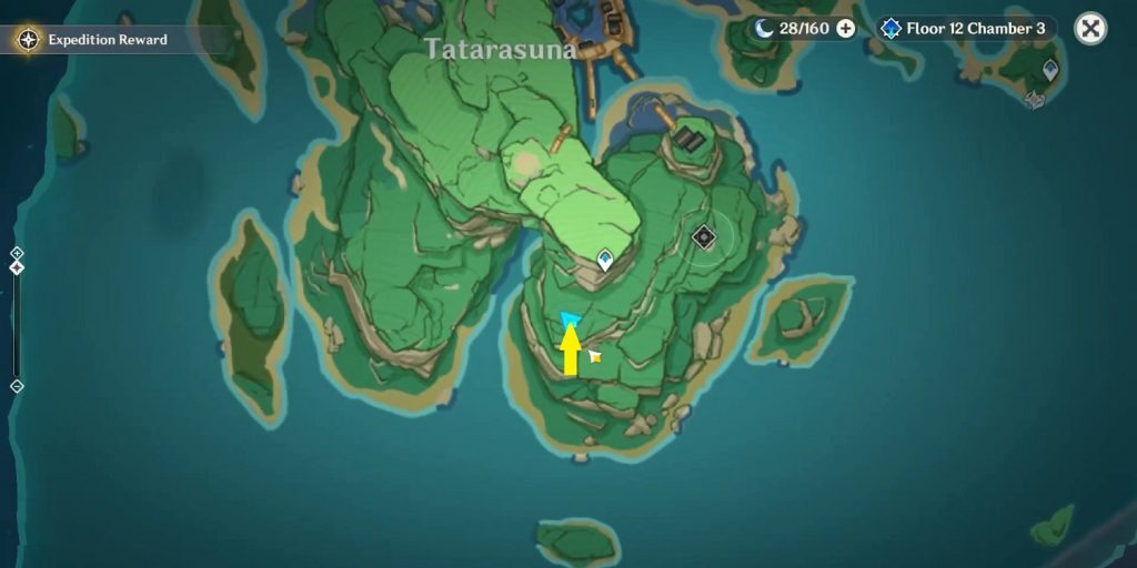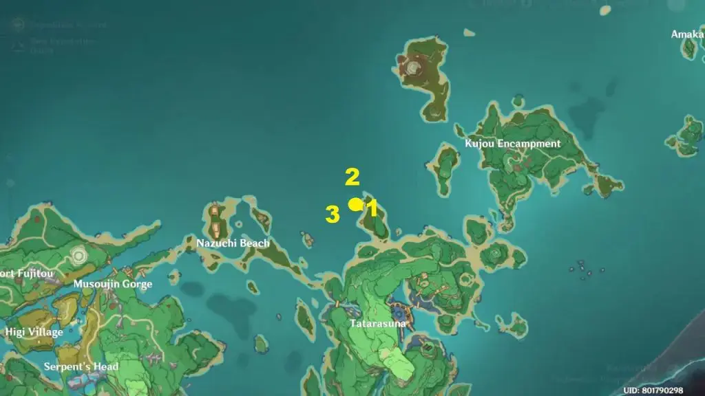 호화로운 보물 상자는 아래 사진과 같이 쿠조우 인캄프먼트 동쪽의 섬과 아마카네 섬 남쪽에 있습니다. 섬의 모든 화분을 깨뜨려야 호화로운 보물 상자가 나타날 것입니다. 아래 두 번째 사진은 섬에 있는 모든 화분들의 위치를 보여줍니다.