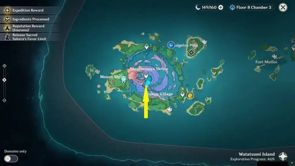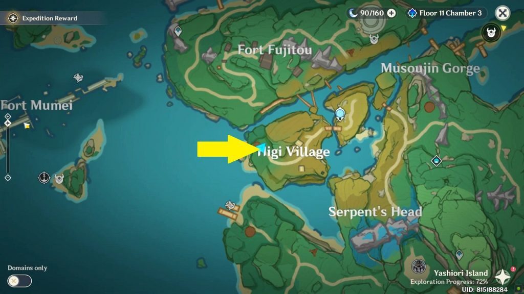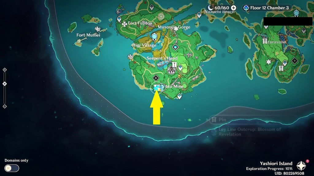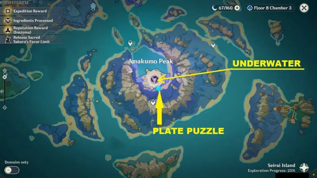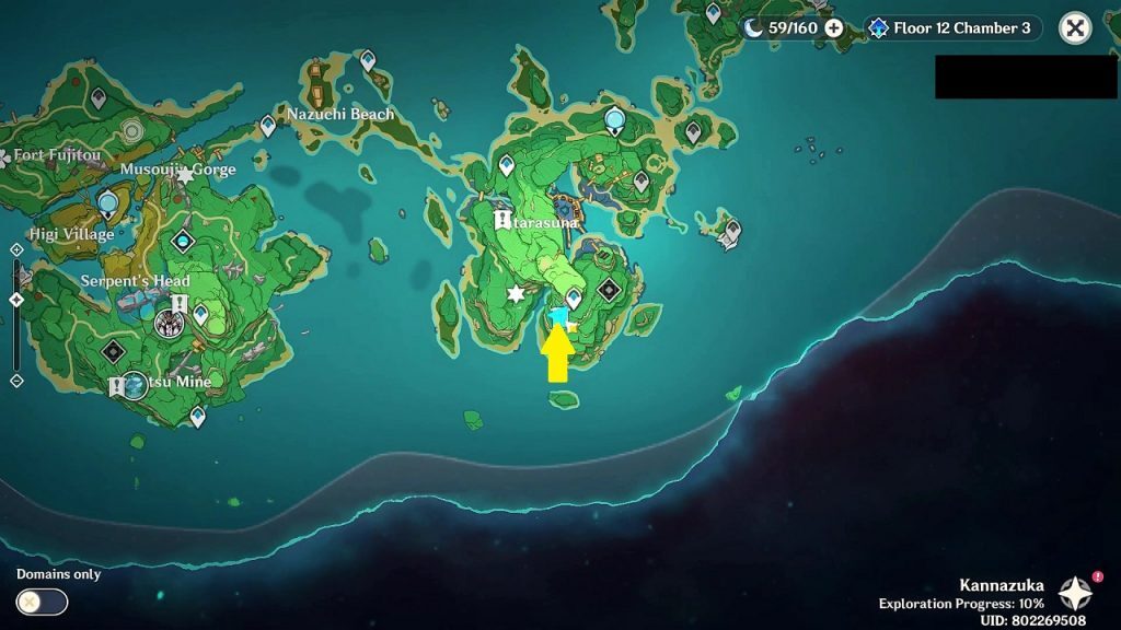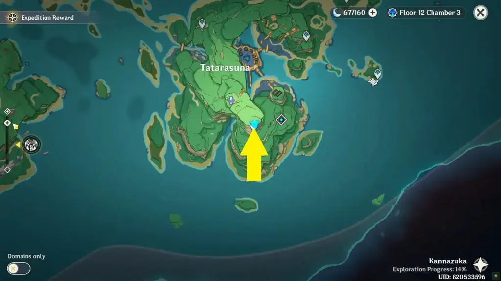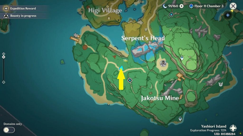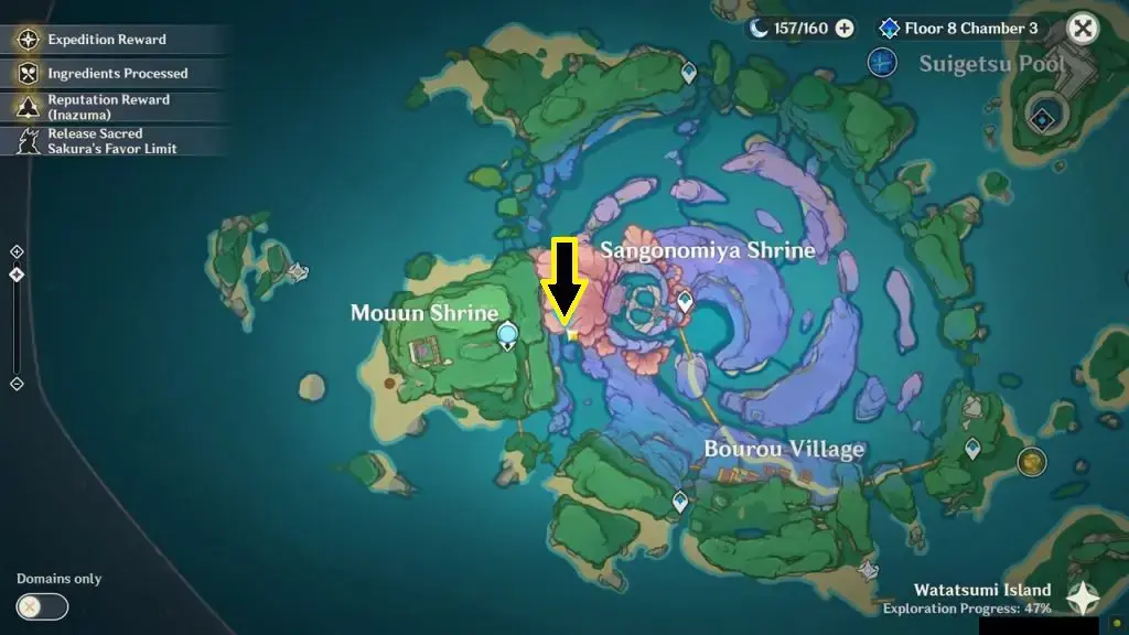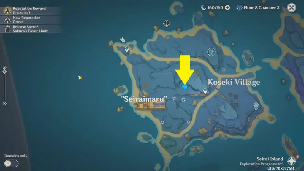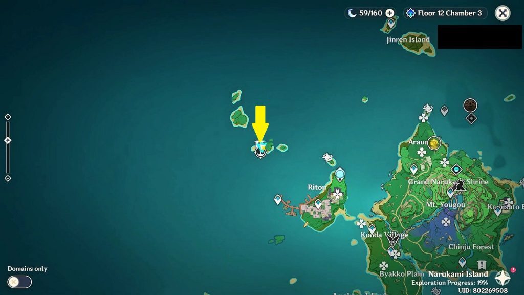 호화로운 보물 상자는 아래 사진과 같이 쿠조우 인캄프먼트 동쪽의 섬과 아마카네 섬 남쪽에 있습니다. 섬의 모든 화분을 깨뜨려야 호화로운 보물 상자가 나타날 것입니다. 아래 두 번째 사진은 섬에 있는 모든 화분들의 위치를 보여줍니다.