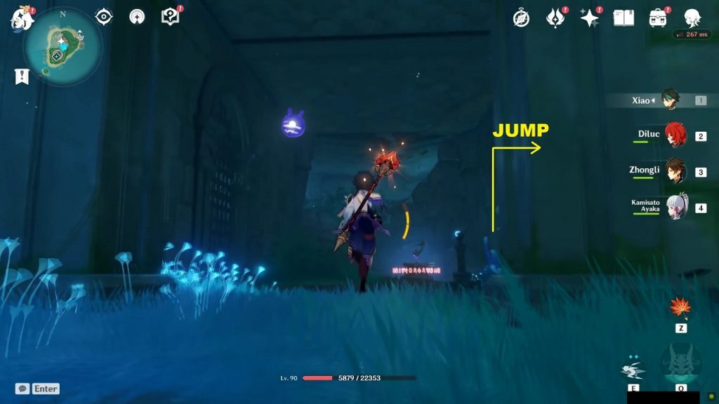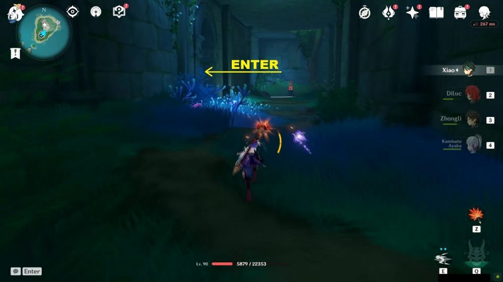 물이 맑아지면 다시 수영장 상단으로 가서 도메인 게이트가 있는 원형 구역으로 뛰어내립니다. 복도를 따라 내려가(도메인 게이트 반대) 아래 그림과 같이 복도 중앙에서 좌회전하십시오.