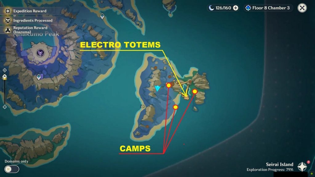 세이라이 섬의 남동쪽에 있는 작은 섬의 동쪽에서 세 개의 밀봉된 전기 토템을 발견할 수 있을 것입니다. 전기 토템의 포장을 풀려면 힐리쿨스 수용소 3곳을 비워야 합니다. 힐리쿨스 수용소 3곳과 전기 토템의 위치는 아래와 같습니다.
