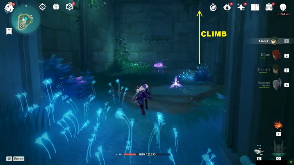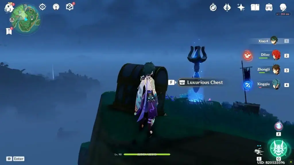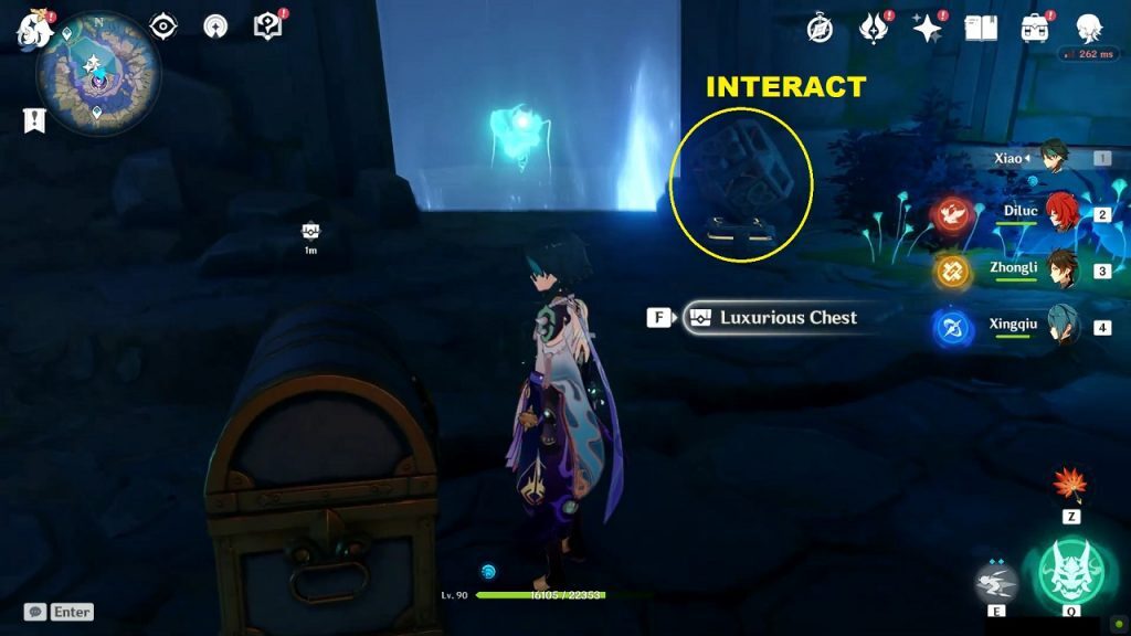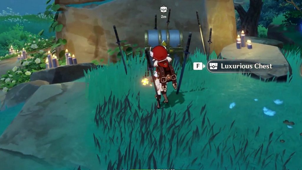 보물 상자를 열려면 뒤에서 접근해야 합니다. 화려한 보물 상자를 열 수 있는 옵션이 나타나려면 보물 상자 뒤에 자신을 적절히 배치해야 합니다. 만약 여러분이 자신을 올바른 위치에 놓기가 어렵다고 생각한다면, 그냥 뛰어내려서 뒤에서 절벽으로 올라가라.이렇게 하면 아래 사진과 같이 호화로운 보물 상자 바로 뒤에 서 있을 수 있을 것입니다.