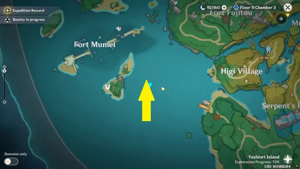 잃어버린 4개의 문자를 모두 모았으면 무메이 요새 남쪽에 있는 작은 섬으로 가십시오. 지도에는 그 섬이 보이지 않습니다. 아래 지도에 노란색 화살표로 표시된 위치로 이동하십시오. 아래 사진과 같이 가까운 곳에 화려한 보물 상자를 가진 큰 바위에 마지막으로 잃어버린 글씨가 붙어 있는 것을 발견할 수 있을 것입니다.