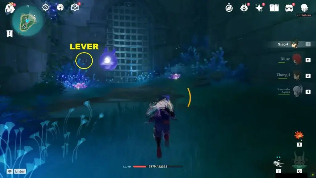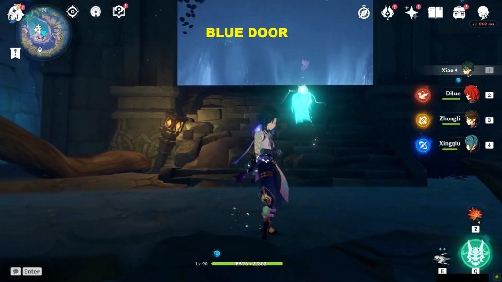 파란 문을 연 후, 방으로 들어가.이 방에서는 화려한 보물 상자를 찾을 수 있을 것입니다. 이 방에는 아래 그림과 같이 스위치와 함께 다른 파란 문이 있을 것입니다. 스위치와 상호 작용하여 물을 완전히 배출하십시오. 이렇게 하면 파란 문도 열릴 것입니다. 물을 빼내면 밑바닥으로 호화로운 보물 상자가 드러났습니다. 지금 열려 있는 파란 문을 지나 뛰어내려가 아래쪽의 호화로운 보물 상자에 닿습니다.