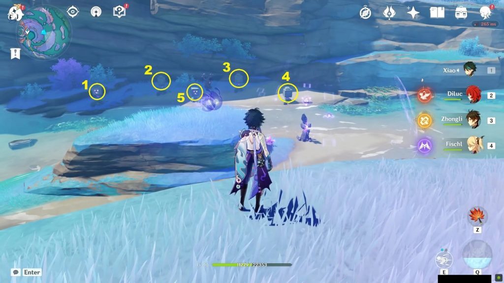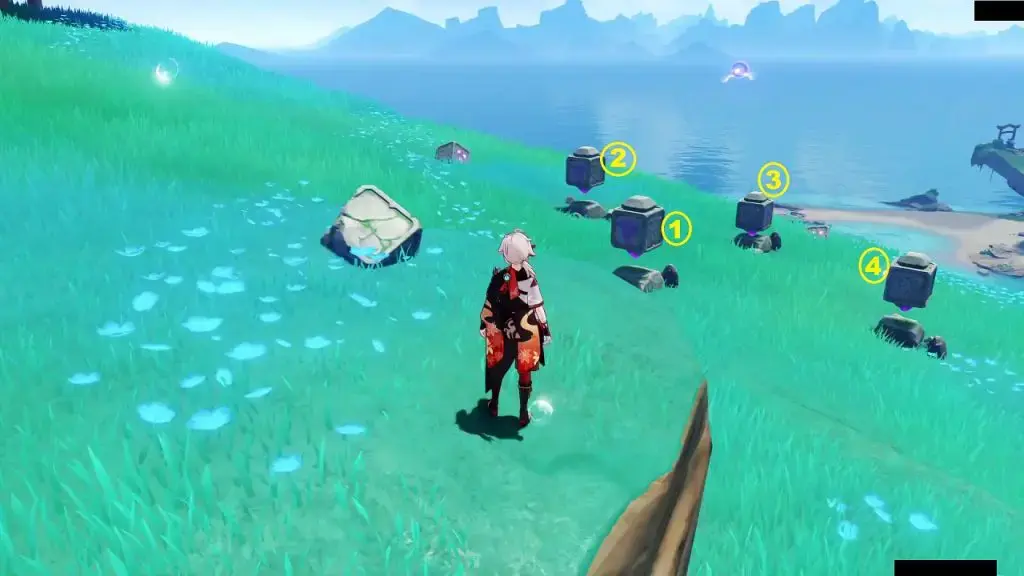 호화로운 상자는 아래 지도에 노란 점이 표시된 위치의 쿠주 진암프먼트 서쪽의 한 섬에 있습니다. 아래 지도에 1,2,3으로 표시된 위치에는 섬 주변 일렉트로 실리가 3개 있습니다. 실리를 쫓아가서 화려한 보물 상자로 가져와 열어라.