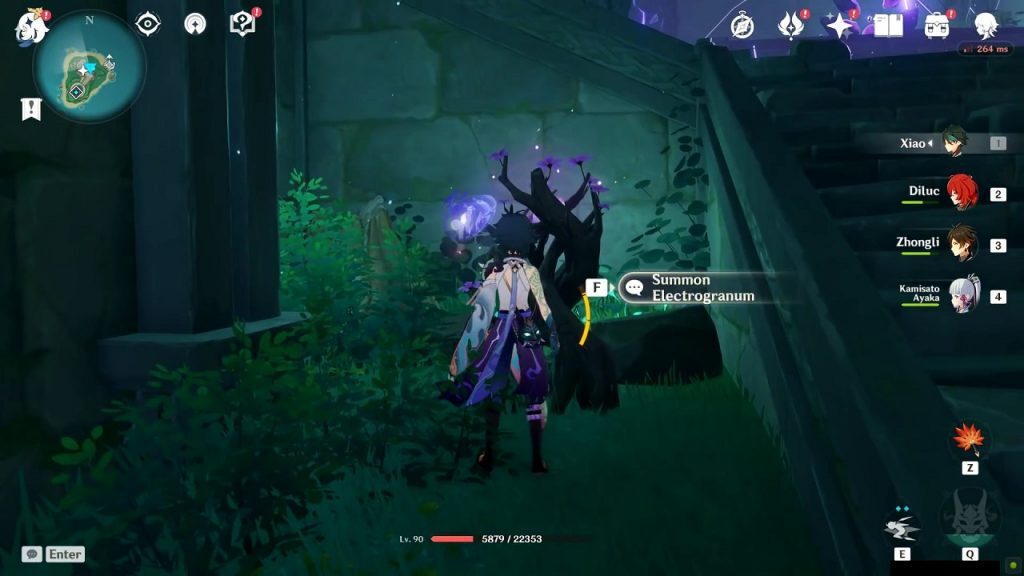 전기 실리를 따라가면 산고니미야 신사의 북동쪽에 있는 썬더 배리어 안으로 들어갑니다. 장벽 뒤의 산을 오릅니다. 산 정상에는 일렉트로그라눔 식물이 있습니다. 일렉트로그란룸을 소환하여 장벽 안쪽으로 들어가 전원을 끈입니다. 이제 다시 전기 실리를 따라가 봐.