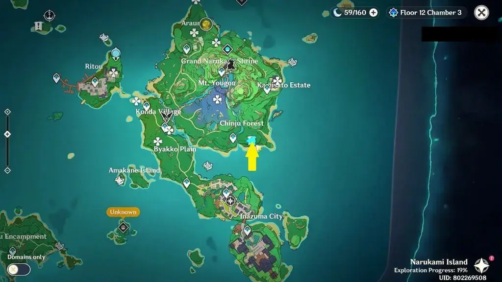 나루카미 섬에는 두 개의 깊은 신사가 있습니다. 하나는 아래 그림과 같이 진주숲 남동쪽에 위치합니다. 사당 안쪽에 호화로운 보물 상자를 갖게 될 것입니다. Deep Keys를 얻는 방법을 보려면 여기를 클릭하십시오.
