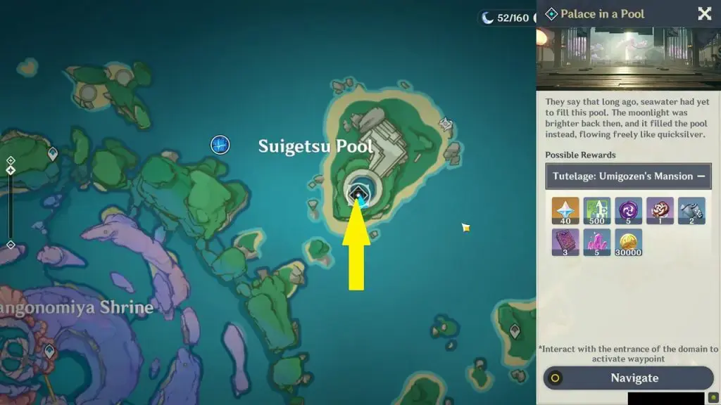 스이게쓰 풀에 있는 'Palace in a Pool' 도메인 근처에 화려한 상자가 하나 있습니다. 스이게쓰 풀장은 아래 사진과 같이 와타쓰미 섬의 북동쪽에 있습니다. 호화로운 보물 상자를 얻기 위해서는 먼저 수영장에서 물을 빼내야 할 것입니다. 수영장에서 물을 빼내는 방법을 보려면 여기를 클릭하십시오.