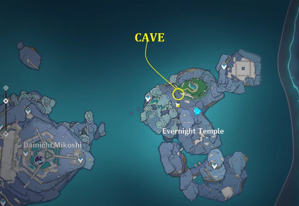 원신 임팩트 2.4 엔카노미야 마지막 숨은 보물 상자 2개 위치, 이 상자는 에버나이트 사원에 있는 작은 동굴을 찾기 위해 표시된 위치로 이동하십시오. 안쪽은 촛불 위 벽에 올라가서 상호작용을 하여 상징 무늬를 드러냅니다.