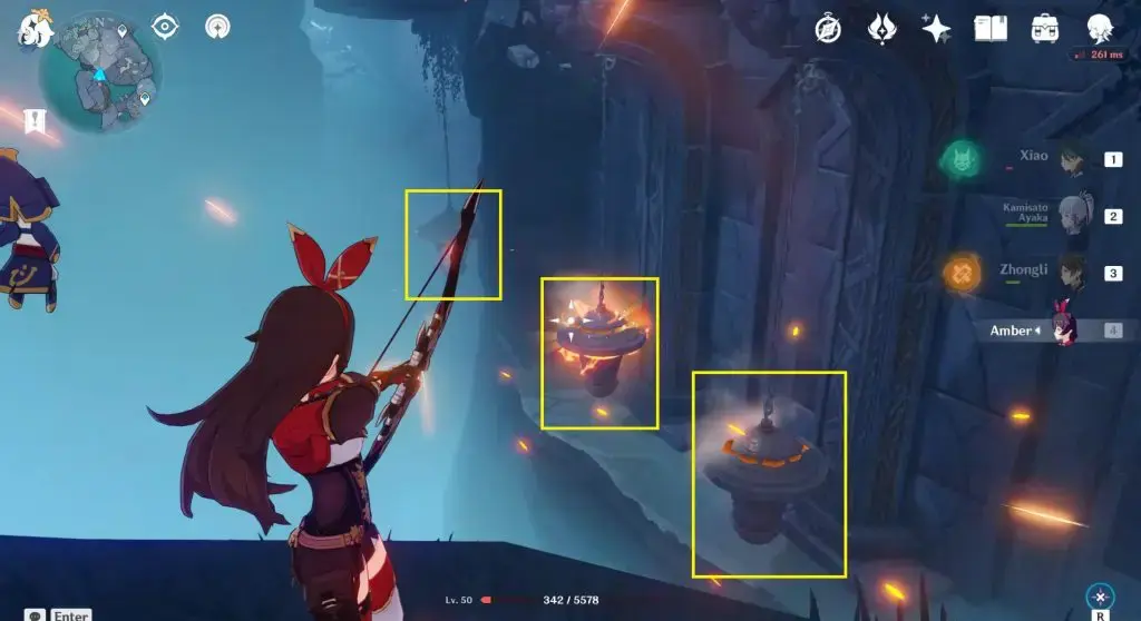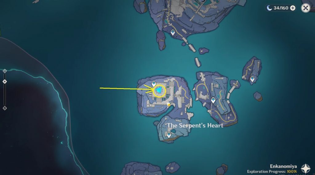 원신 임팩트 2.4 엔카노미야 마지막 숨은 보물 상자 2개 위치, 이 상자는 에버나이트 사원 지역에 위치해 있습니다. 아래 지도에 표시된 위치로 이동하고 다리에서 아래로 점프하여 세 개의 거대한 종 모양의 소방등 구조를 확인하십시오. 보물 상자(금고)을 보이게 하기 위해 세 개의 램프에 파이로 공격을 가합니다.