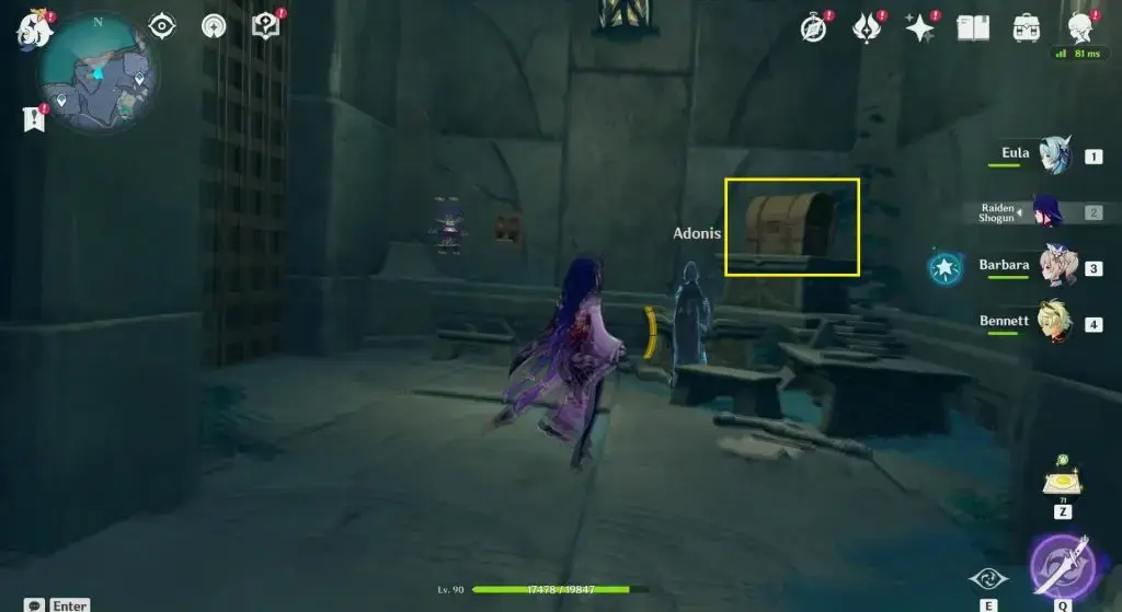 원신 임팩트 2.4 협곡:모든 고급 상자 위치 & 퍼즐 얻는 방법, 이제 두 비행기의 계단을 이용해 아도니스라는 유령과 그의 뒤에 흉터가 있는 지역에 도달합니다. 보물 상자을 열어 밀실 키를 받으십시오.