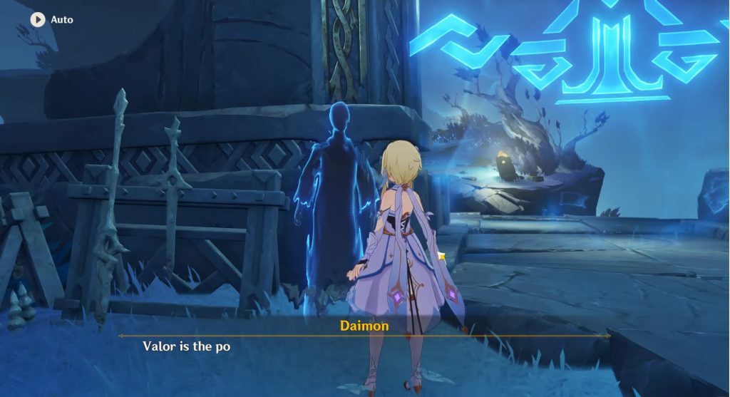 파이로 공격을 이용하여 동상 옆에 있는 4개의 횃불을 작동시킵니다. 삼각형 메커니즘을 사용하여 모드를 변경하십시오. 각 모드에서는 두 개의 횃불만 보일 것입니다. 일단 네 개의 횃불을 작동시키면, 모든 몬스터들을 물리치고 퀘스트에서 더 나아가라.
