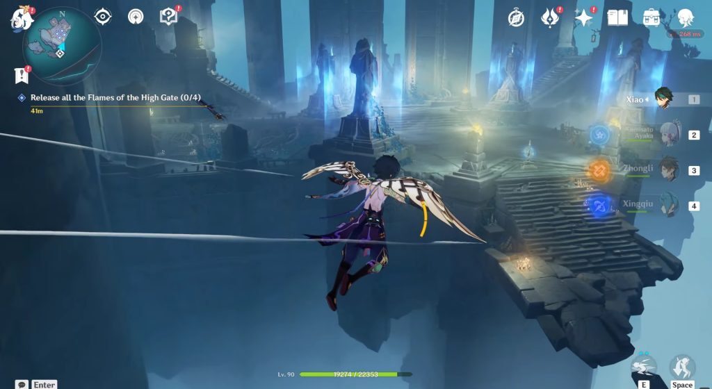 높이에서 수영장 중앙에 위치한 고스트피시 포탈로 이동하여 활공법을 활성화하십시오. 여기서 당신은 고스트피쉬 효과의 반경 내에서 당신의 체류를 조절해야 하며, 이것은 당신을 천천히 위로 떠오르게 할 것입니다. 결국, 당신은 당신을 그 떠다니는 섬으로 데려가는 포탈에 들어가게 될 것입니다. 세 개의 다른 고스트피쉬 포탈이 여러분을 떠다니는 세 개의 섬으로 데려다 줍니다.