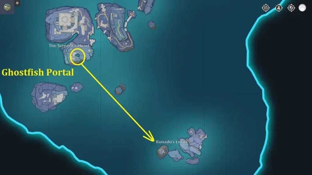 독사의 심장으로 가서 쿠나도 로쿠스의 고스트피쉬 포털 풀장의 표시된 위치로 이동하십시오. 수영장 근처에서 여러 개의 바티스말 비슈랩스를 만나게 될 것입니다. 높이에서 고스트피쉬 포탈로 뛰어올라 활공하기 시작합니다. 쿠나도 로쿠스로 안내하는 포탈로 들어갑니다.